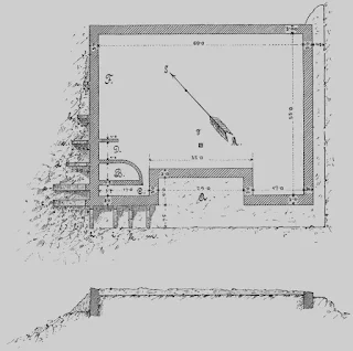Slika 3. prikazuje tlocrt dviju otkopanih zgrada, od kojih I. naznačuje kuću, a II. ekonomičku zgradu zajedno s dvorištem, što kući pripada. Razvaline kuće bile su zatrpane pod slojem zemlje od 1.4 m. Da se dogje do omazanog poda (patosa), trebalo je otkopati 2 m zemlje. Lijepom uzidane uspravne zidine, uzidane od priprosto tesanog lomljenog kamena, bile su održane do visine od 0.9 m.